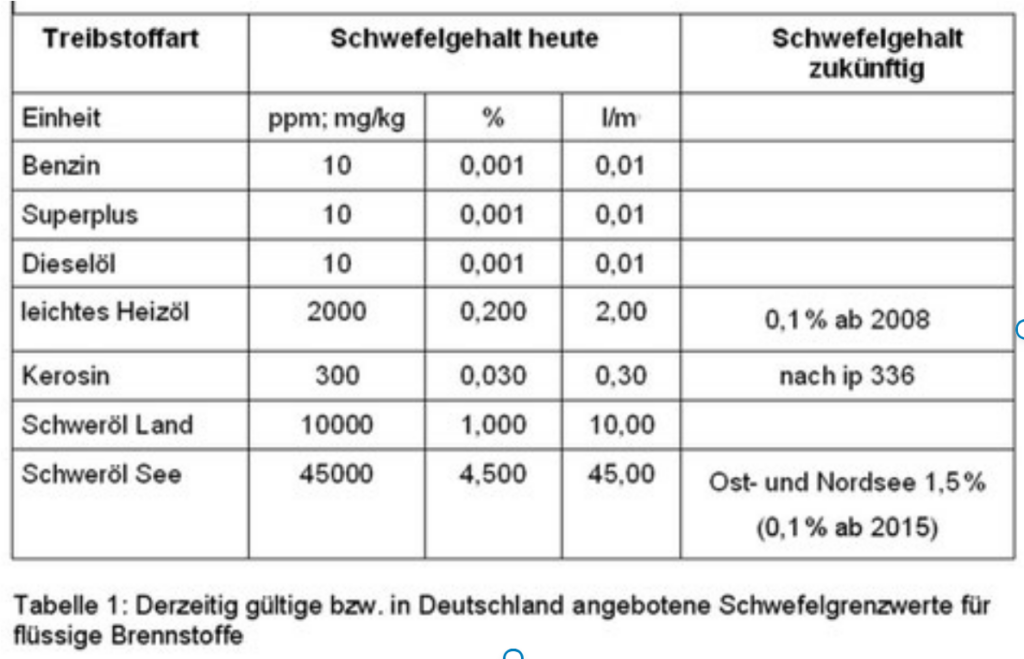 Der Schwefeldioxidausstoß der Schiffsmotoren hängt primär vom verwendeten Kraftstoff ab. In der Seeschifffahrt wird heute vorwiegend hochviskoses Schweröl verbrannt, das auf 100 – 140 °C erhitzt wird, um die benötigte Einspritzviskosität zu bekommen. Ein preiswerter Kraftstoff, der Preis schwankte in den vergangenen fünf Jahren etwa zwischen 60 – 180 $/Tonne, das entspricht 0,06 – 0,18 € pro Liter (2012 rund 650 $/Tonne ). Die Alternative wäre Marine Diesel Öl (MDO) zu 100 – 350 $/Tonne (2012 rund 1.000 $/Tonne ) oder schwefelarmes Schweröl mit 0,6 – 0,9 % Schwefel, das gegen Aufpreis von rund 20 $/t an vielen Bunkerstationen angeboten wird. Der Flugzeugtreibstoff Kerosin (Kerosine ein leichtes Petroleum, ist ein Luftfahrtbetriebsstoff unterschiedlicher Spezifikationen, der vorwiegend als Treibstoff für die Gasturbinentriebwerke von Strahl- und Turbopropflugzeugen sowie Hubschraubern verwendet wird) kostet etwa 180 – 500 $/Tonne ( 1.000 – 1.200 $/Tonne 2012 ). All diese Treibstoffe sind wegen des grenzüberschreitenden Verkehrs und mangelnder Einigkeit der globalen Staatengemeinschaft steuerfrei. Im Schweröl durfte laut IMO bis zu 3,5 % Schwefel enthalten sein, der mittlere Schwefelgehalt lag um 2 – 3 %.