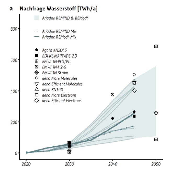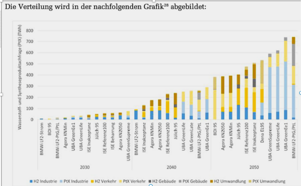 ren auf einen Wasserstoffbedarf jedenfalls von 403 TWh im Jahr; je nach Szenario konkret 403, bzw. 522 oder 433 TWh im Jahr. (NOW, Rechtliche Rahmenbedingungen für ein integriertes Energiekonzept 2050 und die Einbindung von EE-Kraftstoffen, 2018.)