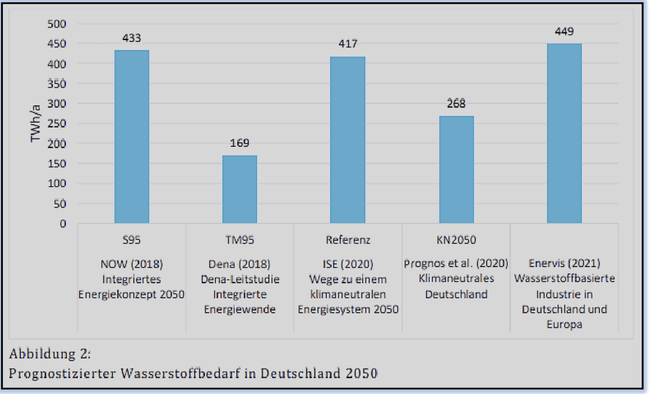 von einem Wasserstoffbedarf für Deutschland von 110 TWh im Jahr 2030, 260 TWh im Jahr 2040 und 450 TWh im Jahr 2050 aus. (Stiftung Arbeit und Umwelt der IG BCE, Wasserstoffbasierte Industrie in Deutschland und Europa, Stand: März 2021, S. 5.)