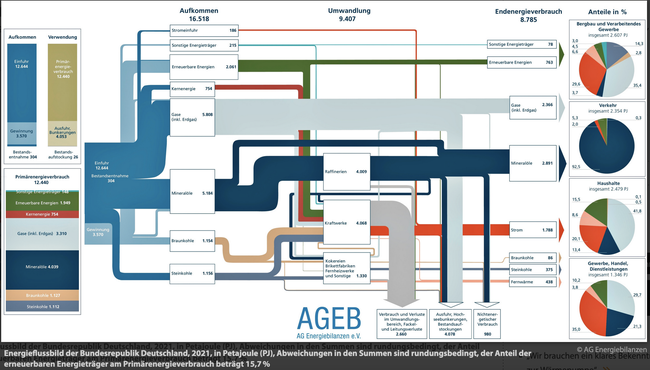 Der Energiebedarf in Deutschland für 2021 ist im folgenden Bild dargestellt und weist einen Primärenergieverbrauch von rund 12440 PJ und 1988 PJ Energie zum Stromverbrauch aus.