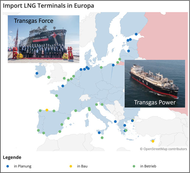 Doch bis überhaupt einmal die vier gecharterten Schiffe eintrudeln, zieht ohnehin noch ein bisschen Zeit ins Land. Nach Angaben von Dynagas handelt es sich bei seinen beiden verpachteten Schiffen um die „Transgas Power“ sowie die „Transgas Force“. Satellitendaten des Schiffsverkehrsportals „Marine Traffic“ zeigen jedoch, dass sich die „Power“ gerade auf dem Weg von der japanischen Metropole Sendai zur US-Hafenstadt Freeport an der Golfküste von Texas befindet. Die „Force“ ist wiederum gerade in der Karibik unterwegs, mit unklarem Ziel.