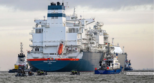 Am neuen Importterminal für Flüssigerdgas (LNG) in Wilhelmshaven ist am Donnerstag den 15. Dez. das Spezialschiff (FSRU) „Höegh Esperanza“ eingetroffen. Das bereits mit LNG beladene Schiff dient als schwimmende Plattform, um von Tankern angeliefertes Flüssiggas anzulanden und wieder in einen gasförmigen Zustand umzuwandeln. Der erste Frachter, der nur LNG transportiert, wird dann Mitte Januar erwartet.