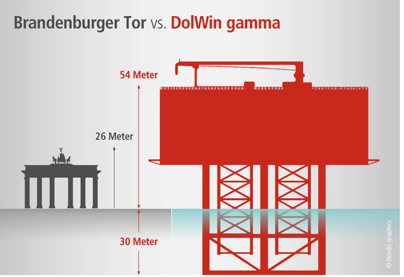 Die riesigen Konverterplattformen stehen weit draußen im Meer, auf einem Stahlgerüst, dessen Fundament bis zu 60 Meter tief in den Boden gerammt wird. Das Gerüst ragt über 20 Meter aus dem Wasser, damit die Wellen die Plattform nicht erfassen. Wie eine kastenförmige Halle sieht sie aus, darin ist die Technik. Die Halle hat eine Länge von etwa 70 Metern, eine Breite von rund 35 Metern und eine Höhe von etwa 30 Metern. Auf dem Dach ist ein Hubschrauberlandeplatz.