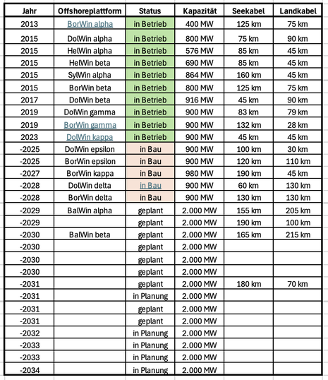 Die folgende Tabelle zeigt die Übertragungsplattformen, die sich derzeit in Betrieb, im Bau und in Planung befinden. Laut Bundeswirtschaftsministerium werden allein für die deutschen Offshore-Windparks zwischen 2030 und 2045 voraussichtlich noch mehr als 20 Konverterplattformen benötigt, die noch an Firmen zu vergeben sind. Hinzu komme der Bedarf in Europa und global. Lloyd-Werft-Geschäftsführer Rönner sagt, dass es ein „Geschäft über die Jahrzehnte“ werden könnte.