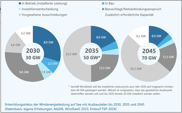 Entwicklungsstatus der Windenergieleistung auf See mit Ausbauzielen bis 2030, 2035 und 2045