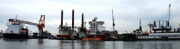 Windanlagen-Errichterschiffe zur Offshore- Stromerzeugung erhielten bei der Lloyd Werft Ihre Hubbeine (Quelle Dr. Hochhaus, Wikipedia)