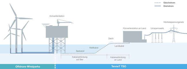 Aufgrund der großen Entfernungen zwischen den Windparks und dem Netzverknüpfungspunkt an Land werden zur verlustarmen Energieübertragung HGÜ-Anlagen (Offshore-Hochspannungs-Gleichstrom-Übertragung) verwendet. Die HGÜ BorWin 1 war weltweit die erste Hochspannungs-Gleichstrom-Übertragungs-Verbindung zur Anbindung von Offshore-Bauwerken. Sie dient der Anbindung des ersten kommerziellen deutschen Offshore-Windparks „BARD Offshore 1“ an das deutsche Hochspannungsnetz und damit auch an das europäische Verbundnetz.