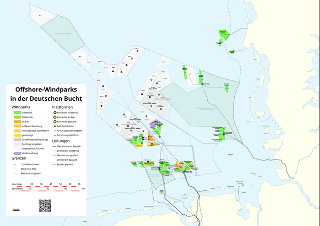 Die meisten deutschen Offshore-Windparks in der Nordsee befinden sich in der deutschen Ausschließlichen Wirtschaftszone (AWZ), die eine Entfernung von mindestens zwölf Seemeilen von der Küste aus hat. Die Windparks bestehen aus 40 bis 120 Windenergieanlagen, bei älteren Windparks einem internen Kabelnetz im Windpark (33 kV) und einer Umspannplattform zur Spannungserhöhung auf 155 oder 220 kV.