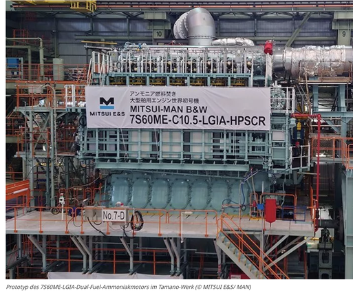 Der japanische Mitsui-Konzern hat mit der Erprobung des weltweit ersten kommerziellen, mit Ammoniak betriebenen Dual-Fuel-Zweitaktmotors begonnen – ein Prototyp eines MAN-Motors (Quelle Mitsui)