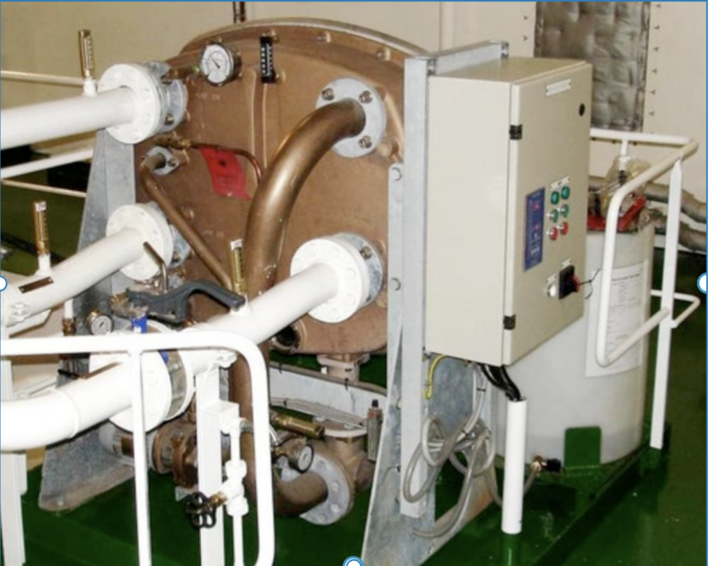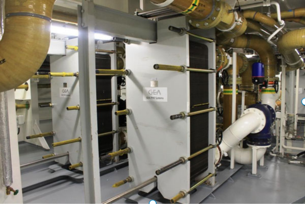 Das Sekundärsystem besteht aus zwei Frischwasserkreisläufen, die je nach Hauptdieselmotor von angehängten Pumpen oder von Elektromotoren angetrieben werden. Diese Kreisläufe werden zur effektiven weiteren Wärmeausnutzung in das Hoch- und Niedrigtemperatursystem (HT, NT) aufgeteilt. Das HT-System wird zur Beheizung der Kraftstoffbunker und des Frischwassererzeugers genutzt. Über die Plattenkühler (Abb. 9) sind die Frischkühlwassersysteme mit dem Seekühlwassersystem verknüpft. Andere stromsparende Möglichkeiten zur Versorgung des Seekühlwassersystems (Scoopkühler, Seekasten-, oder Außenhautkühlung) wurden in [12] beschrieben