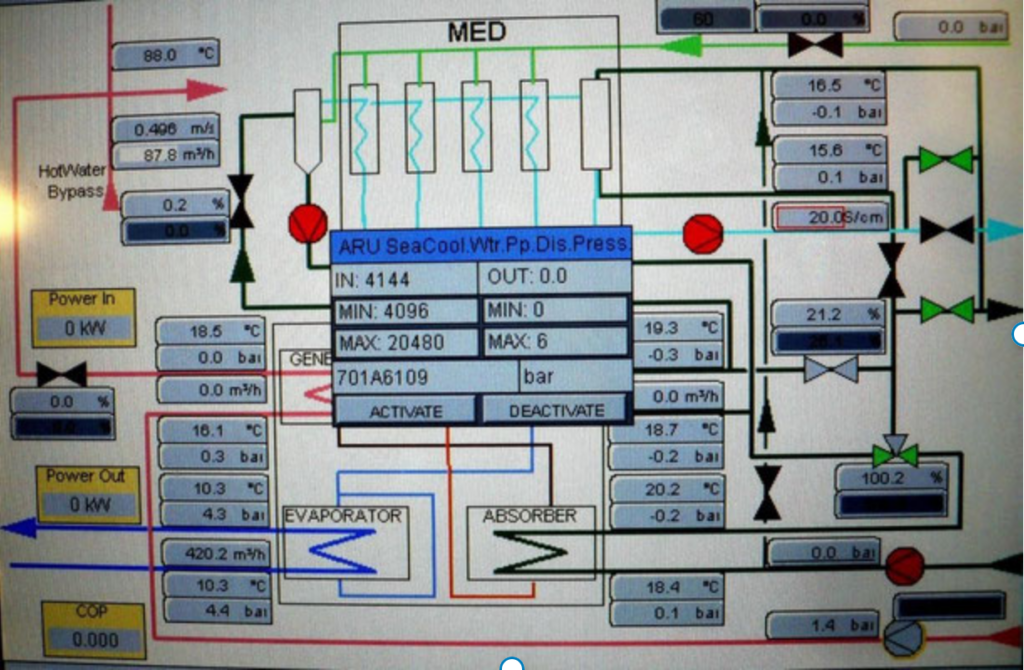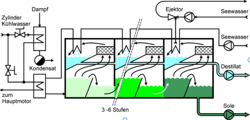 Mit der einfachen und kostengünstigen Frischwassererzeugung aus Seewasser, die durch Unterdruckverdampfung (Verdampfer Abb. 18) mit Abwärmebeheizung erfolgt, wurden die Frachtschiffe unabhängiger von den Häfen. Im Trinkwassersystem erfolgt die Aufbereitung des Frischwassers zu Trinkwasser. Der Reeder spart dadurch die Kosten für das Bunkern von Trinkwasser, auf dem Schiff wird weniger Platz benötigt und ein geringeres Gewicht erreicht. Das ursprünglich zweite, mit Seewasser betriebene und durch starke Korrosionen sehr störanfällige, System für die WC-Spülung wurde überflüssig. Auf heutigen Schiffen befindet sich daher nur noch ein Frischwassersystem für Trink- und Brauchwasser. Zusätzliche Rohrleitungen, Pumpen, Armaturen und Vorratstanks werden eingespart. Auf Kreuzfahrtschiffen mit hohem Trinkwasserbedarf werden mehrstufige Verdampfer (Abb. 19) und außerdem Umkehrosmose-Anlagen (Abb. 20) eingesetzt.