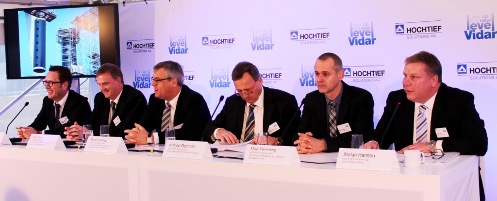 Das auch als Kranhubschiff bezeichnete Offshore-Windanlagen-Errichterschiff „Vidar“mit Heimathafen Hamburg wurde am 12.12.2013 nach einer Pressekonferenz (Abb. 1) und einer Rede vom ehemaligen Bundesminister Klaus Töpfer in Bremerhaven getauft und anschließend der Öffentlichkeit vorgestellt. Dabei lag das international als „Self-elevating Unit“ bezeichnete Errichterschiff aufgejackt im Hafen vor der ABC-Halbinsel (Abb. 2) und wurde hier in den folgenden Tagen ausgerüstet.