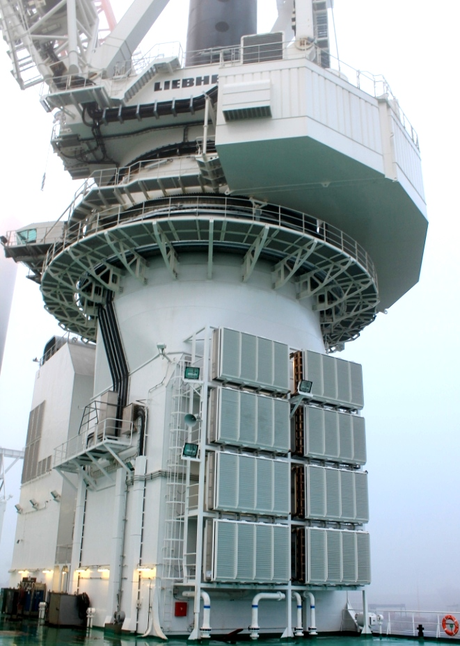 Beim Aufjacken und im aufgejackten Zustand dagegen wird die Rückkühlung des Frischkühlwassers statt des Seewassers in einem Luftkühlsystem durchgeführt. Die dazu notwendigen insgesamt 16 Luftkühler sind auf den Rückseiten der hinteren Aufbauten angeordnet (Abb. 12), die auch die zylindrischen Beine und den Offshore-Kran enthalten (Abb. 6).