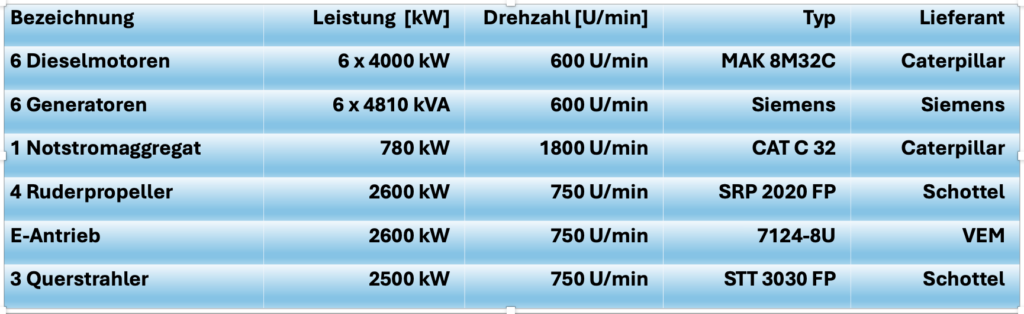 Die Antriebsanlage (Daten s. Tabelle 2) besteht aus sechs Dieselgeneratoren und 4 Ruderpropeller (Abb. 7). Die Dieselmotoren wurden von Caterpillar geliefert und die Generatoren kommen von Siemens. Die Dieselgeneratoren leiten ihren Strom mit der Mittelspannung von 6.600 Volt und der Frequenz von 60 Herz zu den Schalttafeln. Von hier