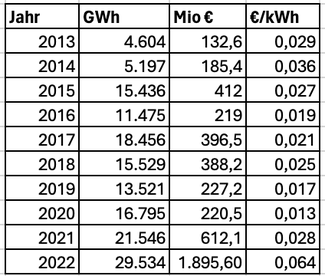 In folgender Tabelle sind die Gigawatt-Stunden, Kosten und spezifischen Kosten für die Rehdispatch-Maßnahmen in Deutschland von 2013-2022 aufgeführt.