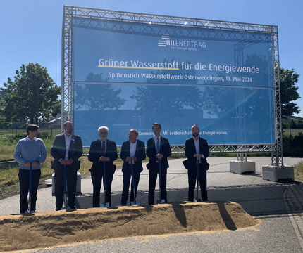 In Osterweddingen bei Magdeburg tritt die Energiewende in die nächste Phase: Mit dem Spatenstich im örtlichen Industriepark beginnt 2024 der Bau eines Elektrolyseurs von ENERTRAG, über den lokale Industrieunternehmen künftig ihren Wasserstoffbedarf decken können.