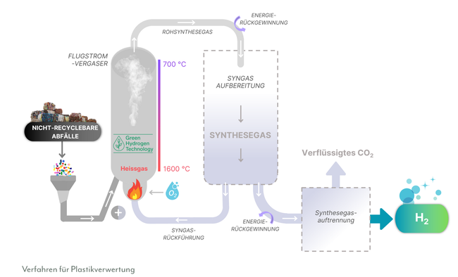 In der ersten Phase wird prozesseigenes Synthesegas mit Sauerstoff verbrannt und so ein Heißgas von 1.500 bis 1.700 Grad Celsius erzeugt. In den Heißgasstrom wird im patentierten ChemQuench-Verfahren von Green Hydrogen Technology Kunststoff eingeblasen und vergast. Es entsteht energieeffizient ein wasserstoffhaltiges Synthesegas.