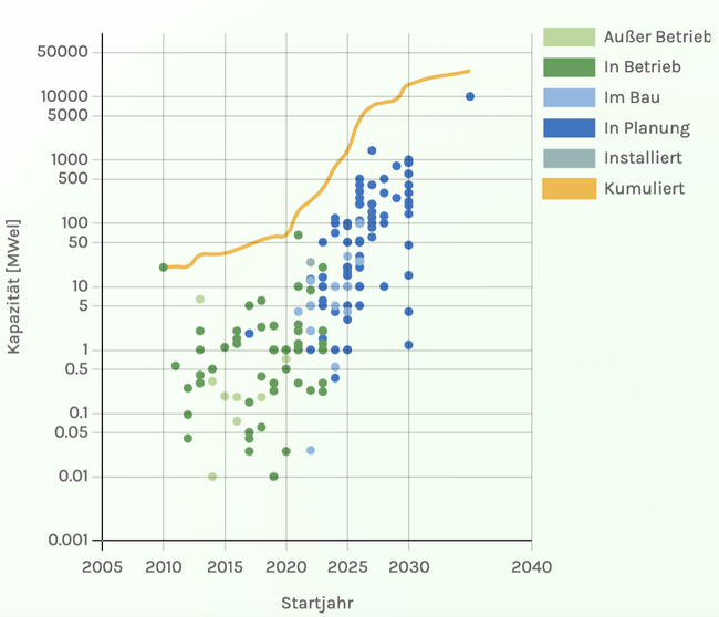 Angekündigte Elektrolyseprojekte nach aktuellem Status, geplanter bzw. installierter Leistung und dem (voraussichtlichen) Startjahr der Wasserstoffproduktion. Kumuliert ergeben diese Leistungen die gesamte Elektrolysekapazität, die im Wasserstoff-Kompass aufgenommen ist.