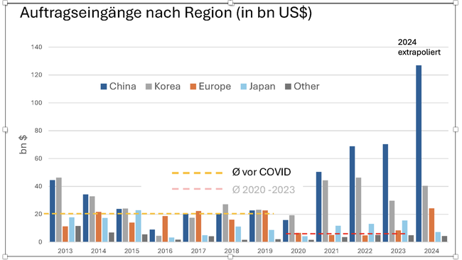 Folgendes Blld: Schiffbau, Aufgangseingänge nach Region. In Milliarden US-Dollar (Quelle VSM)